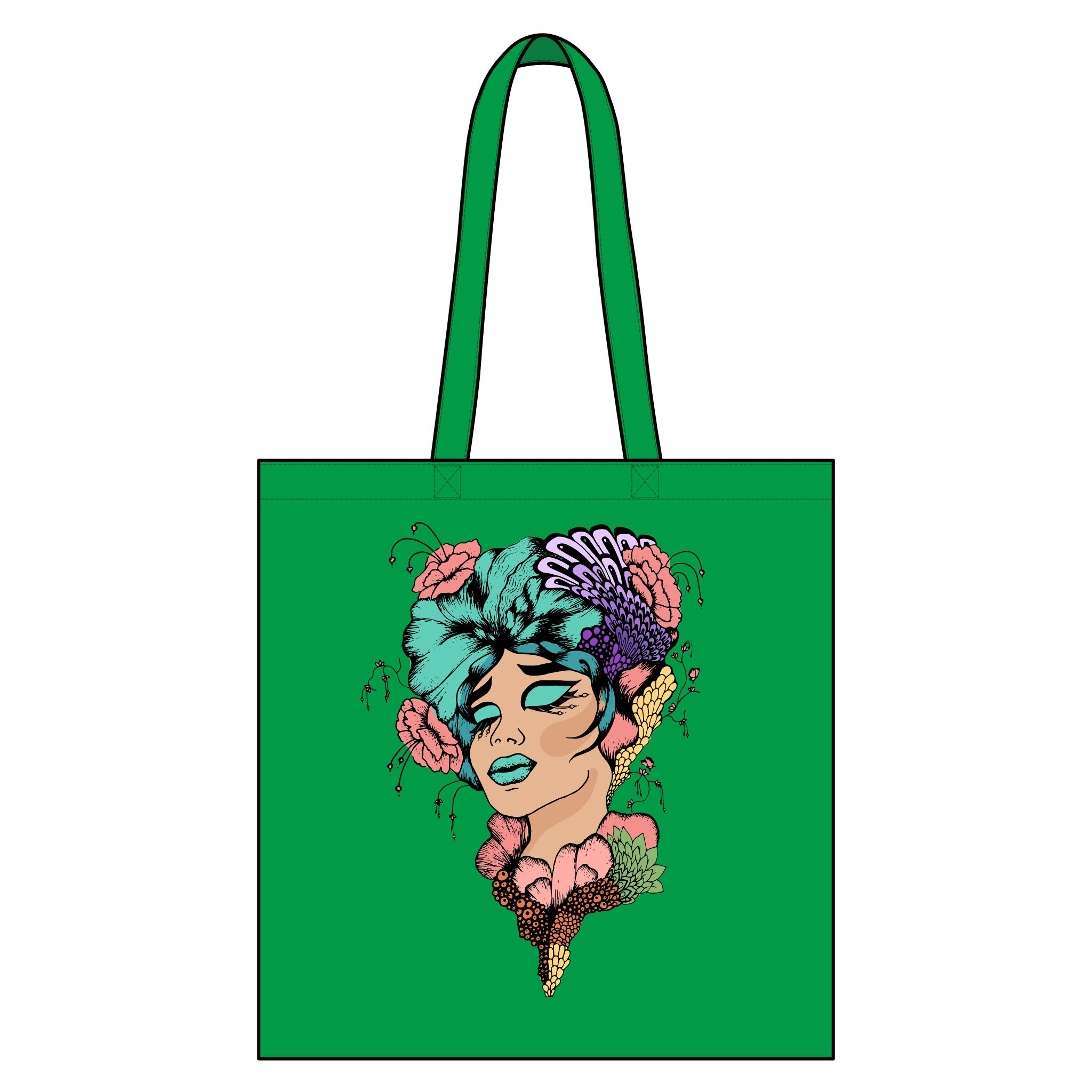 Soft and sturdy, this canvas grocery bag carries more than groceries — it carries a mood. Made from organic cotton canvas, this canvas shopping tote feels strong yet comfortable. It features a bold illustrated portrait blooming with flowers, textured color, teal hair, and pastel petals. As a result, the design delivers a slightly surreal, vintage-comic vibe that feels artistic and expressive.