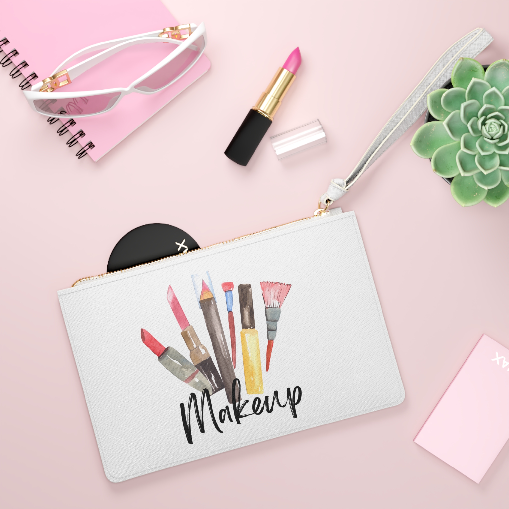 Lightweight and chic, this clutch bag brings the studio to your side with effortless style. Watercolor-style brushes and lipstick bloom across a clean white surface, while the playful hand-lettered word “Makeup” anchors the design beautifully. The saffiano-finish faux leather clutch bag holds its shape, and a gold metal zipper with a handy wrist strap keeps your essentials secure and easy to carry. Inside, two compartments and a small pocket neatly organize brushes, lipsticks, cards, and a compact—perfect for moving from quick touch-ups at a shoot to evening drinks with friends. Crafted with care and assembled in the USA, this clutch bag feels like a polished accessory that celebrates creativity and everyday beauty routines.