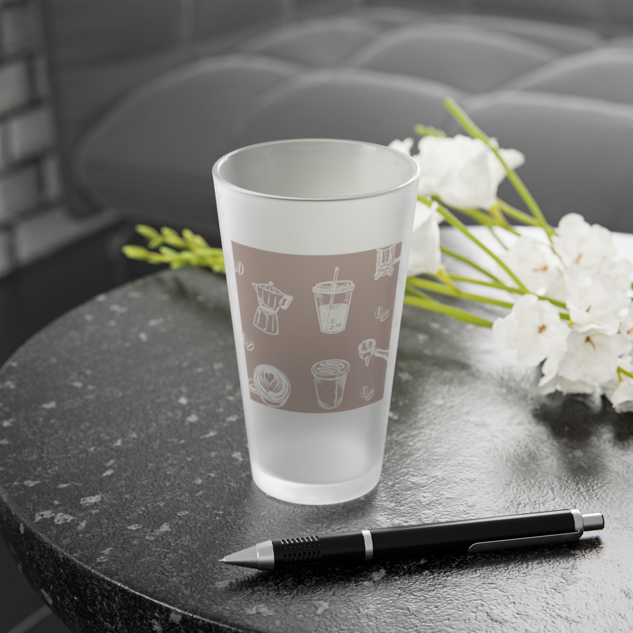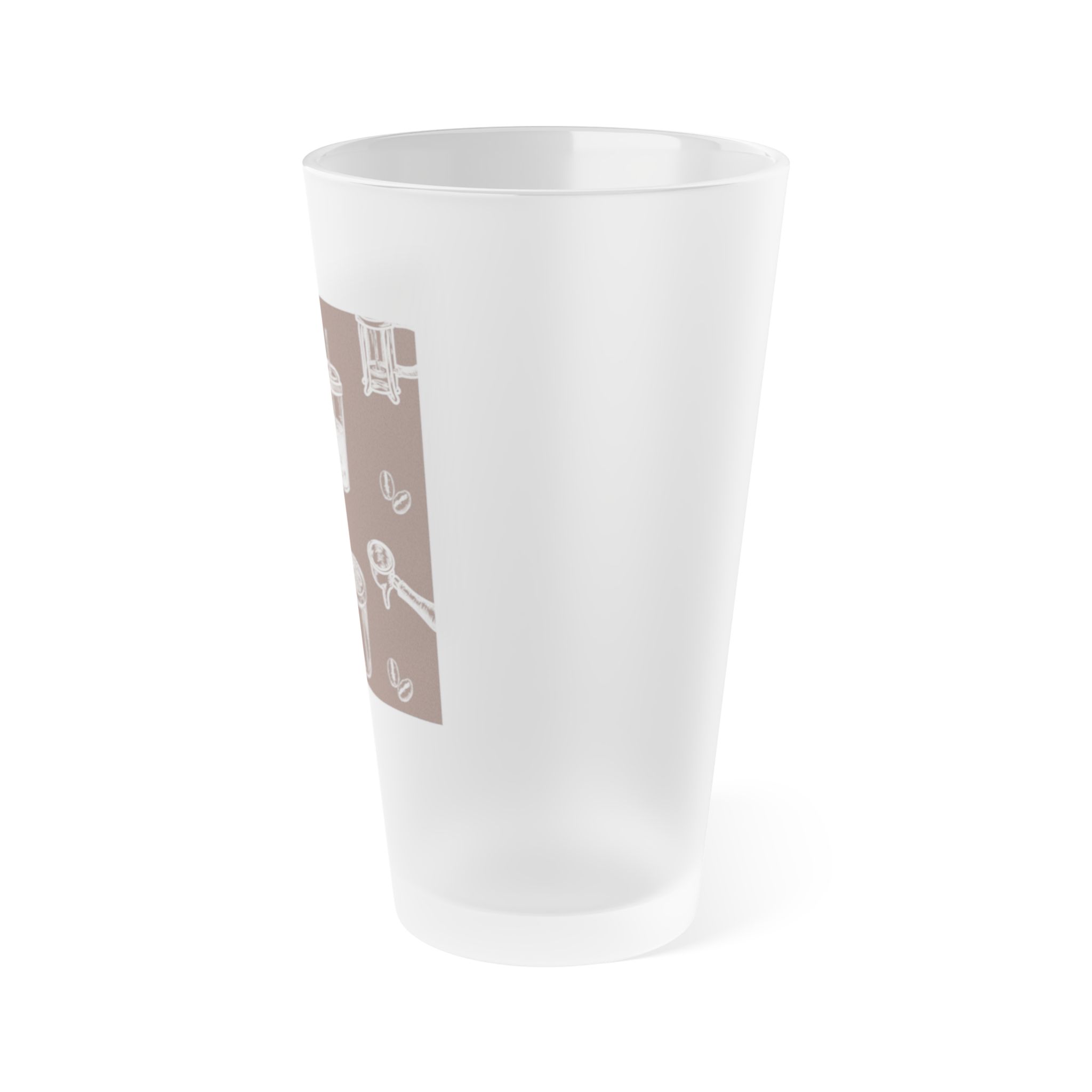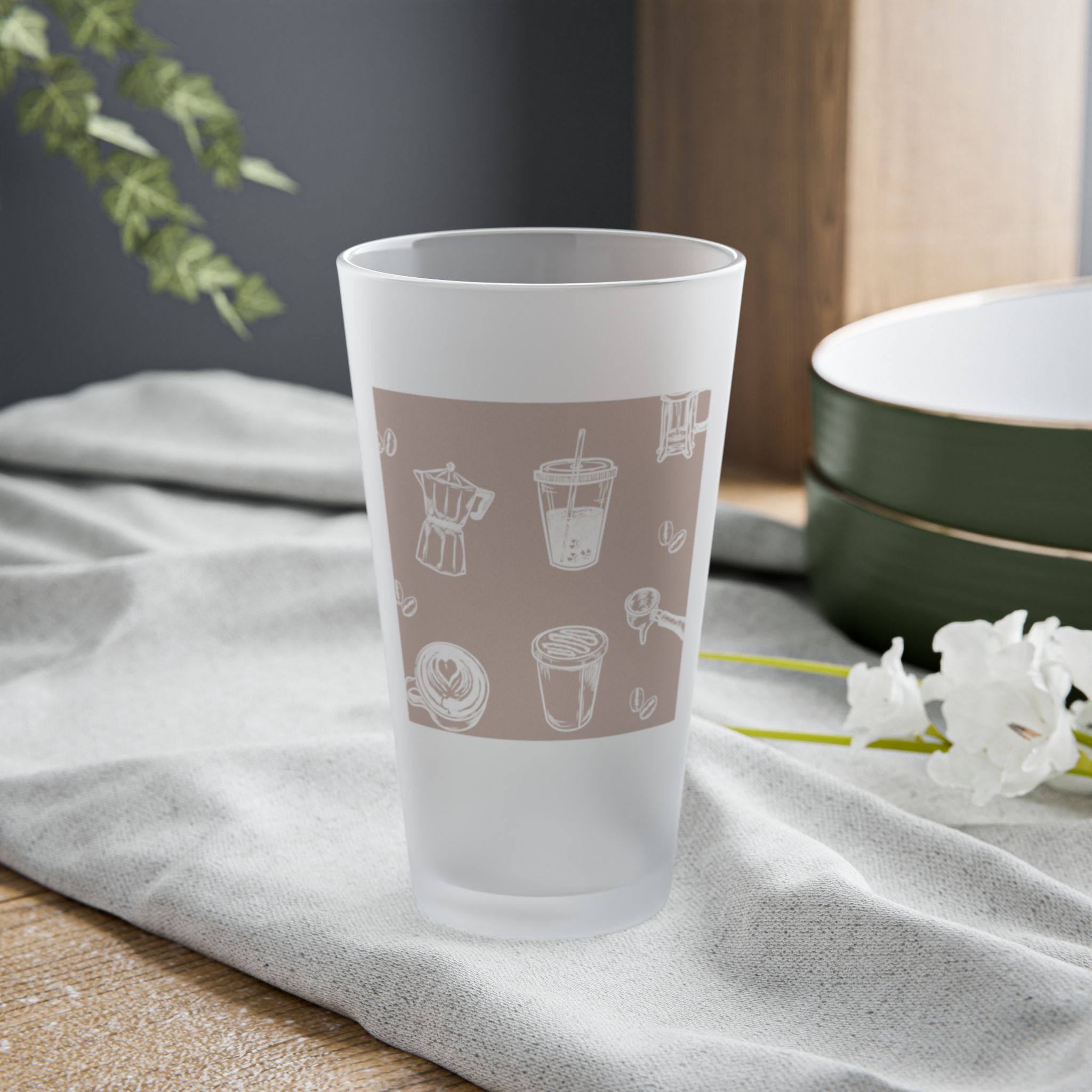 A softly frosted 16oz pint glass with a subtle, semi-translucent wraparound design that feels quiet and familiar. The matte finish mutes bright reflections and lets the illustrated coffee-and-kitchen motif float beneath the surface, giving each sip a calm, everyday ritual. Lightweight and dishwasher-safe, this glass suits morning routines, slow brunches, and late-night chats — it slips into daily life without shouting, but adds a little handcrafted charm to the table.