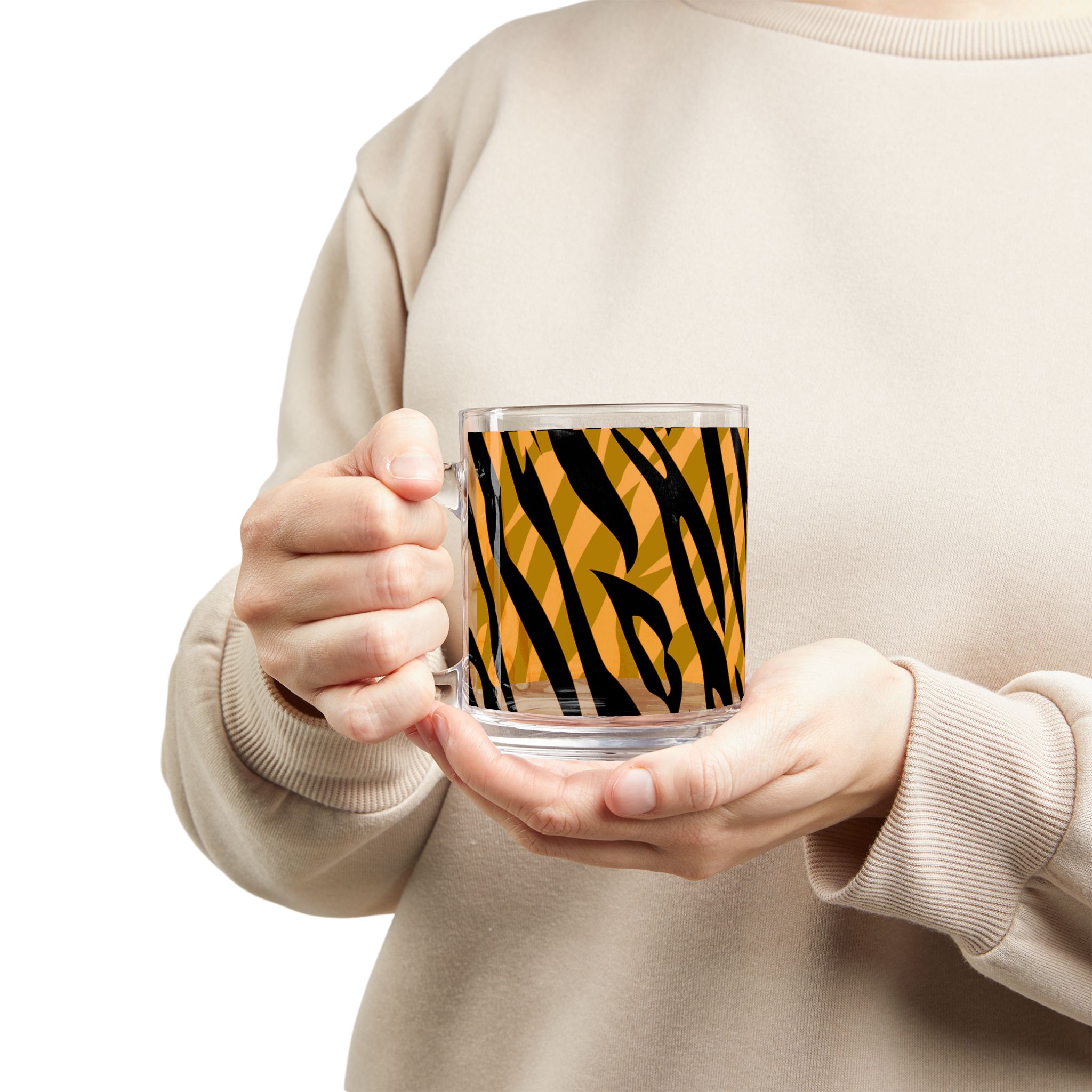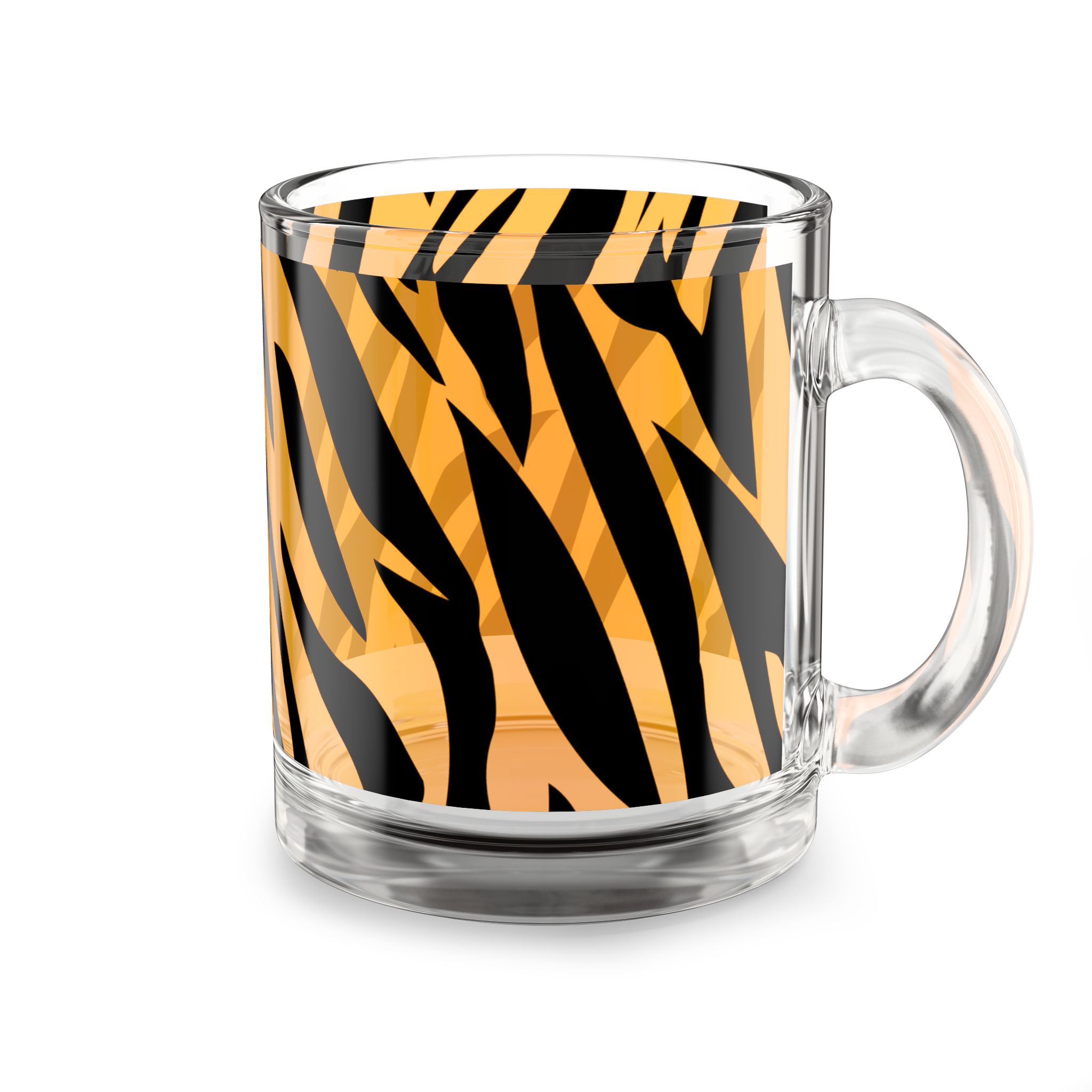 This 10oz clear glass mug brings bold wildlife energy to everyday sips. The striking tiger-stripe wrap contrasts rich amber tones with deep black strokes, giving the glass a lively, modern look while still letting the drink show through. The ergonomic C-shaped handle sits comfortably in the hand for a relaxed morning coffee or an evening tea. Durable, heat-resistant glass holds a modest 0.3 L and feels substantial without being heavy. It’s a spirited piece for someone who likes pattern-forward, adventurous kitchenware and wants their drinkware to reflect a playful, confident style.