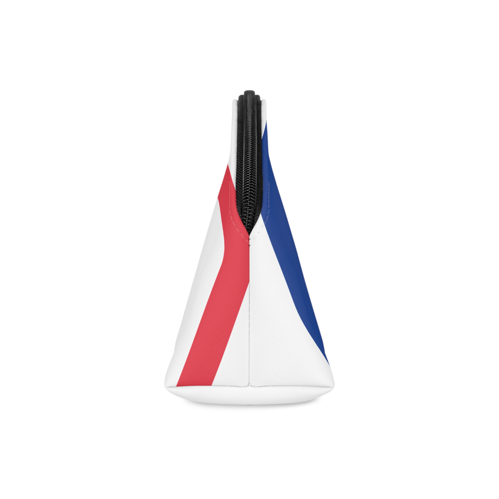 A compact, curved PU leather makeup bag that carries a playful, graphic energy. Bold blocks of red, white and blue form abstract shapes and stars across the curved silhouette, giving this pouch a modern, pop-art feel. The detachable leather wrist strap and smooth black zipper make it easy to grab and go. Inside, a single black-lined compartment keeps essentials organized without bulk. Lightweight and durable, this little pouch slides into a tote or sits on a bathroom counter with personality. It’s for someone who likes clean, modern graphics and a bit of Americana-inspired color in their daily routine.