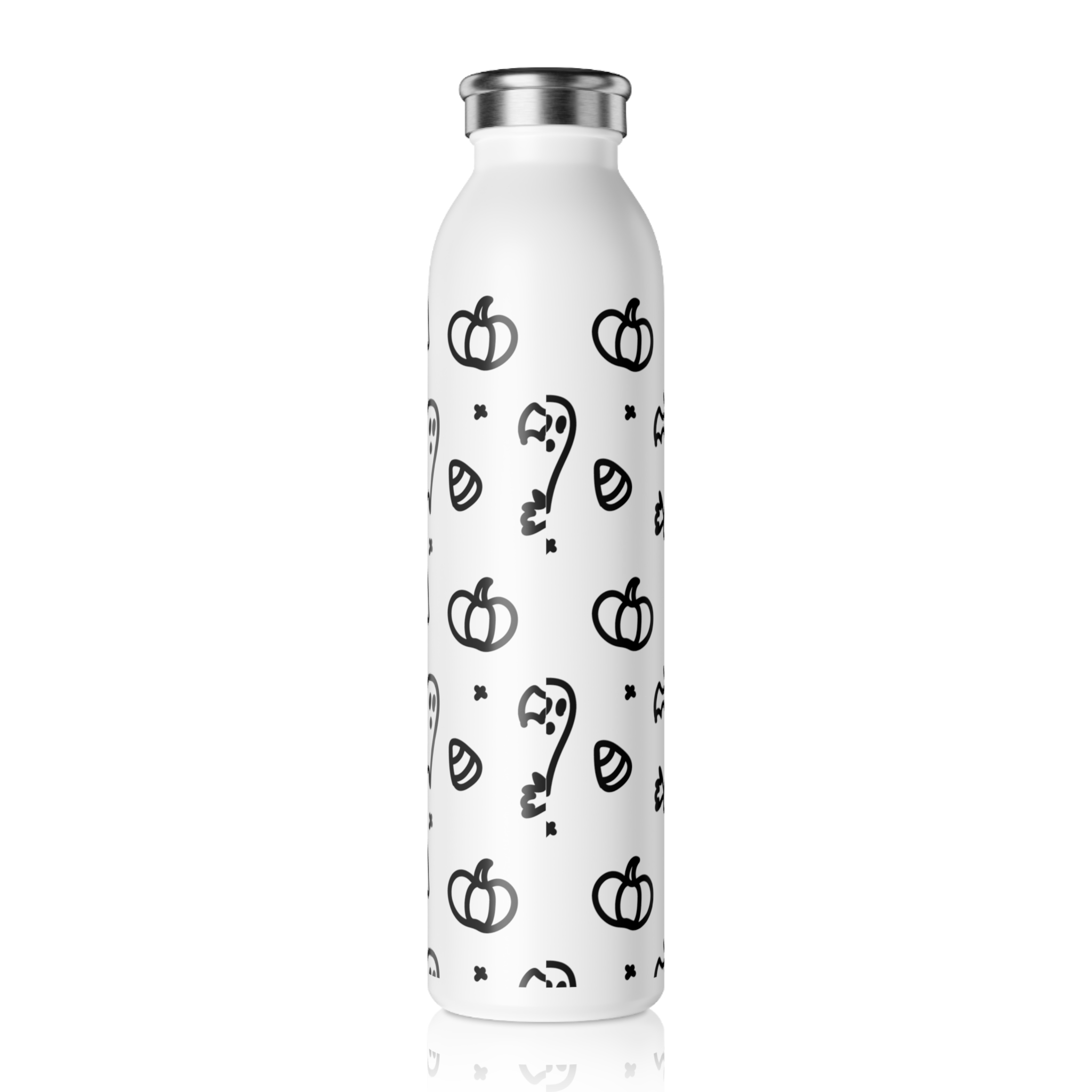 A slim, stainless steel water bottle wrapped in a playful monochrome Halloween doodle pattern. The double-walled, vacuum-sealed construction keeps drinks hot or cold for hours while the matte-finished body and glossy print give the design a crisp, modern look. Lightweight and narrow enough to slip into a daypack or commuter bag, this 20 oz bottle has a silver stainless cap and is built to resist rust and staining. Hand wash only to preserve the glossy print and finish. Its cheerful ghosts, pumpkins, bats, and candy bring a subtle seasonal vibe without being loud — great for sipping on the go during crisp autumn walks, pumpkin-patch visits, or cozy days at the office.