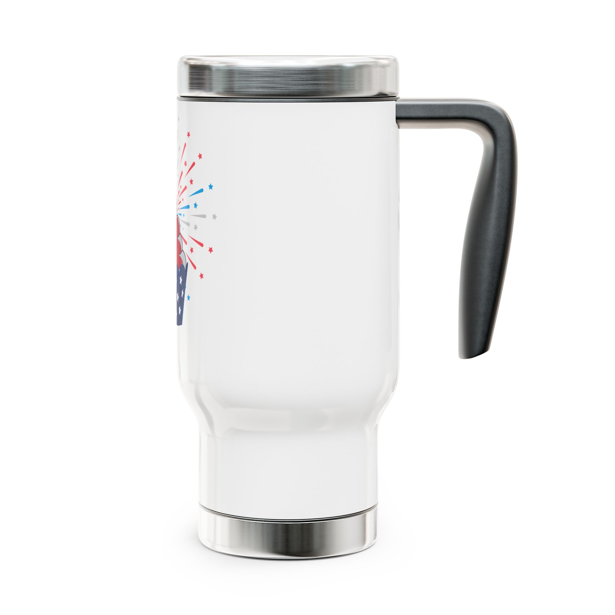 This 14 oz stainless steel travel mug brings a festive, patriotic vibe to your daily commute or holiday gatherings. Lightweight yet sturdy, it keeps drinks at a comfortable temperature thanks to inner plastic insulation, while the glossy full-color wraparound print makes the cupcake-and-fireworks artwork pop. The ergonomic handle and spill-resistant snap-on cap with removable silicone loop make it easy to carry and use on the go. Bright, lasting colors and a sleek white enamel finish give it a celebratory look that fits summer cookouts, parades, and backyard parties.