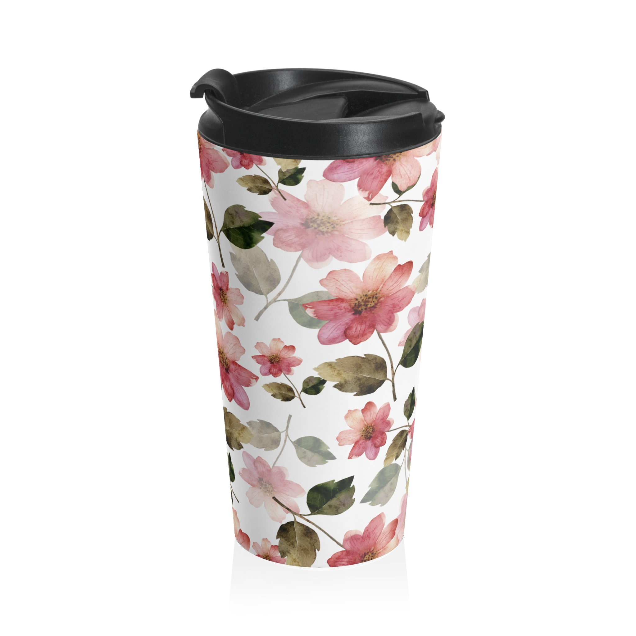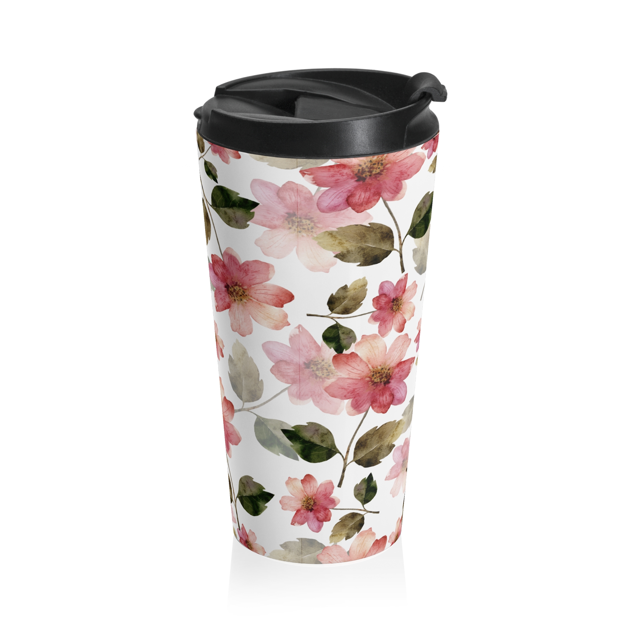 This 15 oz stainless steel travel mug brings a soft, watercolor floral touch to your everyday routine. The lightweight, vacuum-insulated body keeps drinks at the right temperature while a black screw-on lid with flip top locks in warmth and prevents spills. The hand-painted pink blooms and muted green leaves wrap the tumbler in a calm, cottagecore vibe — a gentle companion for morning commutes, slow afternoons in the park, or carrying a warm drink into a chilly studio. It feels like a small ritual: uncap, inhale the steam, and move through your day with a little floral pause.